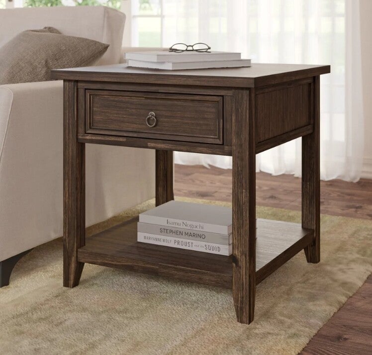 Drawer is accented with weathered ring pulls in Antique Brass and uses traditional wooden glides