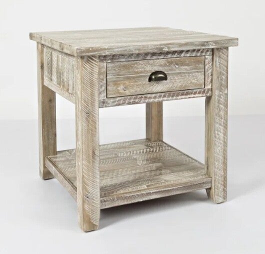 Features one storage drawer with tasteful distressing and wooden glides